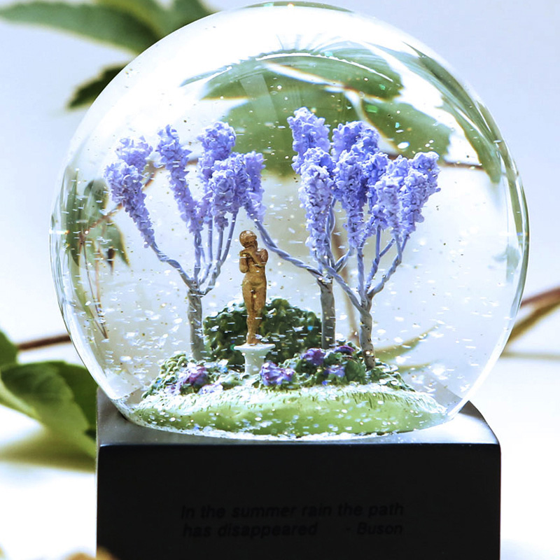 在舒适温情的家中或紧张且忙碌的工作环境中,摆放与季节相同的水晶球,相映成彰,仿佛水晶球中的世界更贴近心中的景色,可缓解疲劳和压力,也可让本就平静的心更加惬意悠然。摆放与季节不同的水晶球,透过光线和水晶球看到与现实不符的美丽的景色,似是另一个奇妙的世界,时空转换般,别有一番风情。